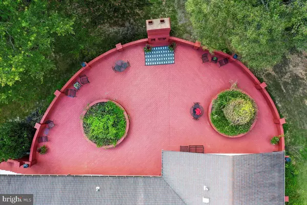 Grand Entertainer's Patio: Expansive outdoor living area with a brick fireplace, tons of seating/entertaining space, and surrounded by mature landscaping for privacy.